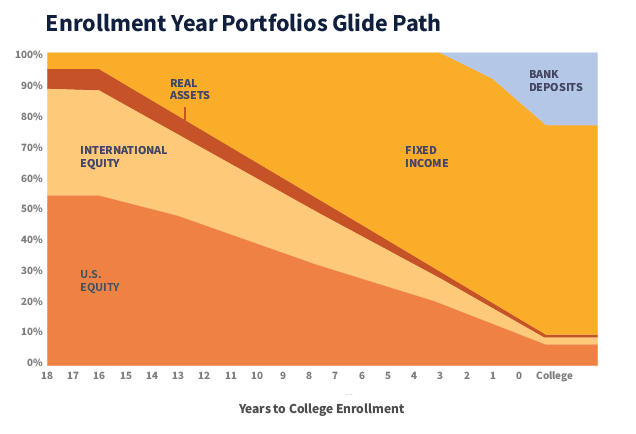 Passive Enrollment Year Portfolios primarily invest in underlying index funds. They are designed to allow you to select a Portfolio based upon the year your Beneficiary is expected to enroll in school or the year in which you expect to withdraw funds (the “Enrollment Year”), and your risk tolerance.